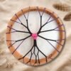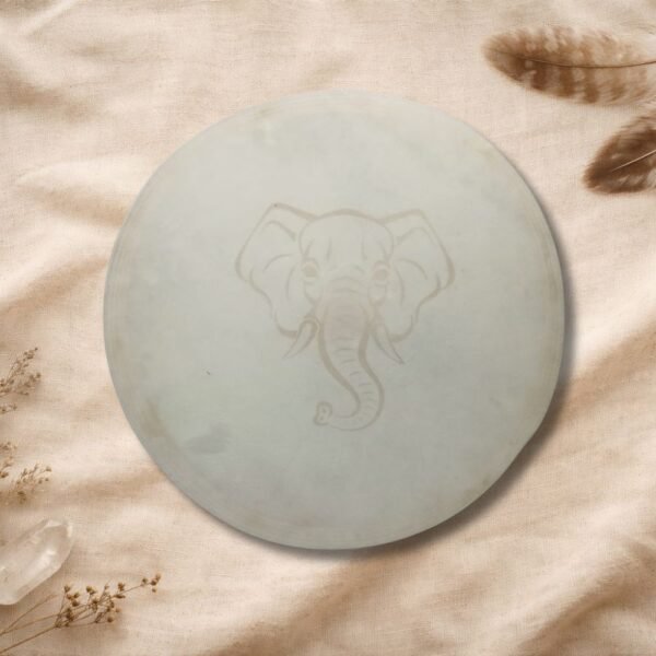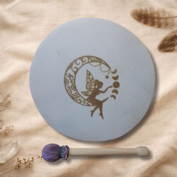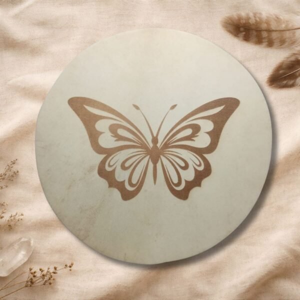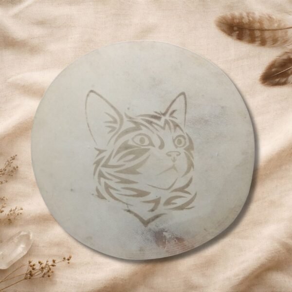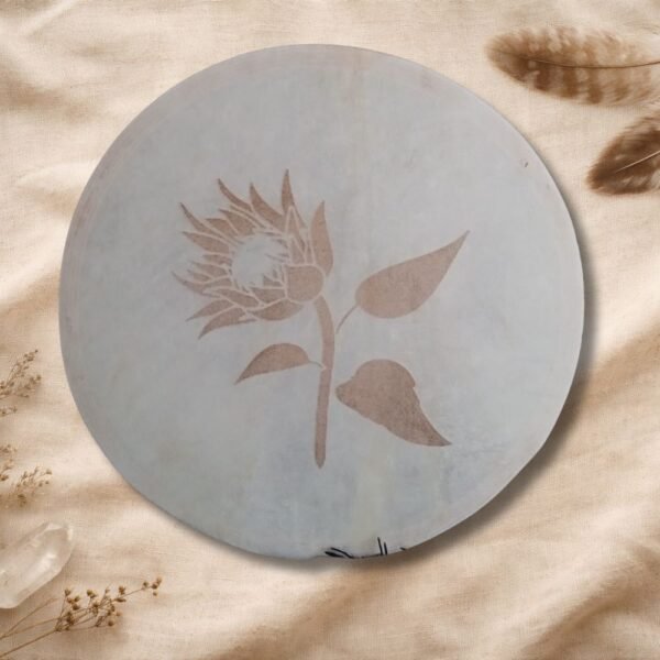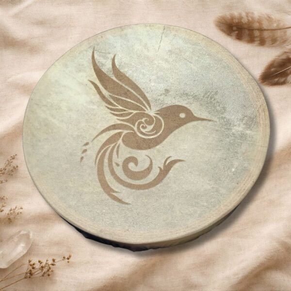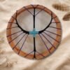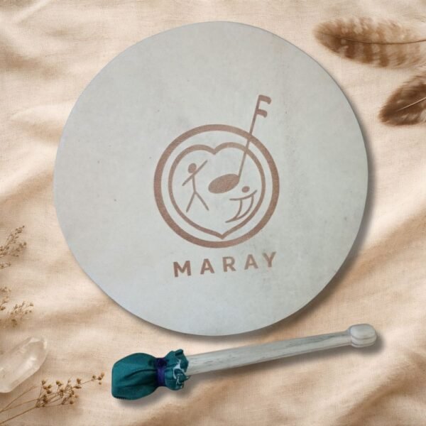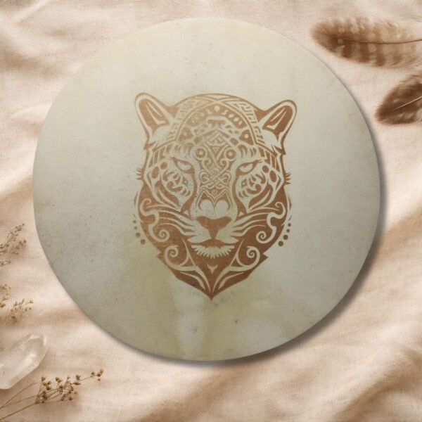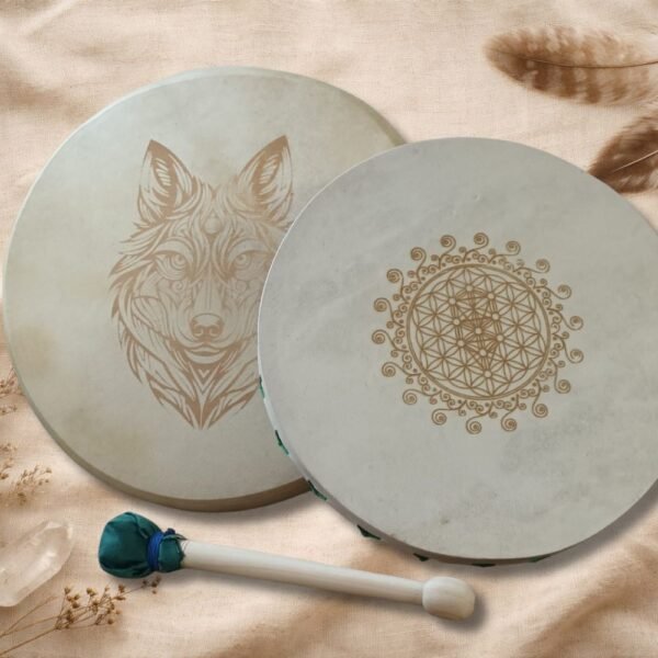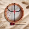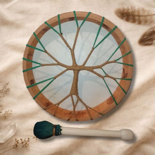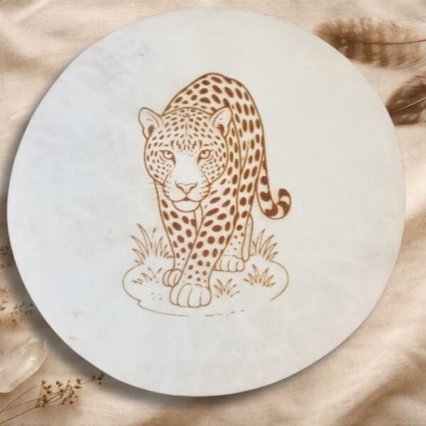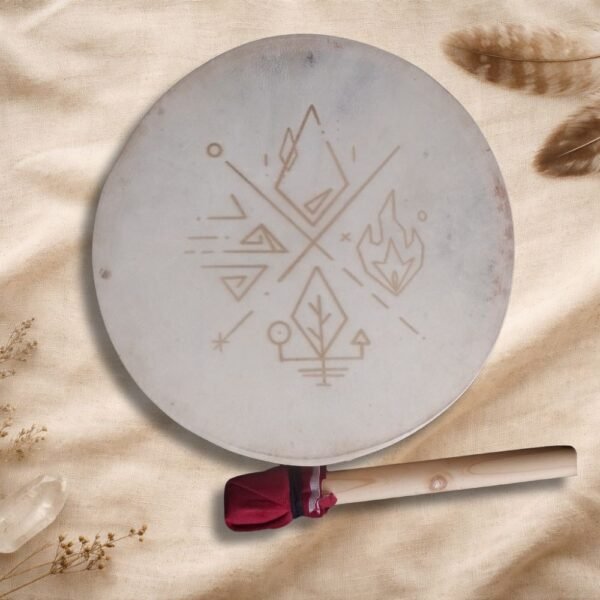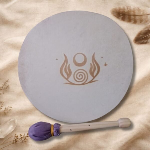 Además, el tambor incluye un grabado en el cuero, realizado con dedicación y precisión, integrando símbolos, imágenes o diseños que acompañan y sellan energéticamente el propósito del instrumento. Este grabado convierte cada tambor en una obra viva, cargada de significado y poder personal.