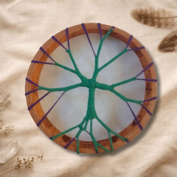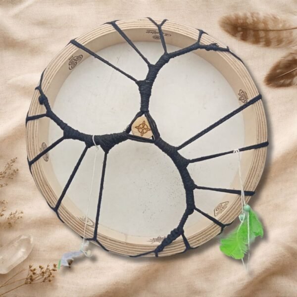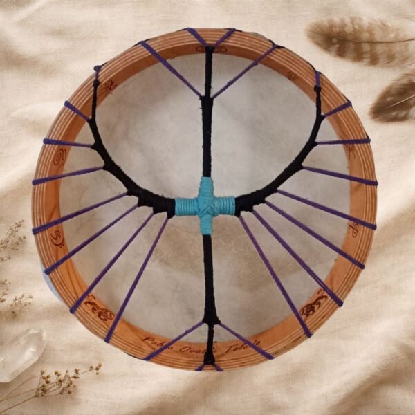 El tejido interior también puede ser personalizado. Puedes elegir la forma del tejido, así como los colores de los cordones, permitiendo que cada tambor refleje tu intención, tu energía y tu camino espiritual. Cada entramado se realiza de forma cuidadosa, respetando la tensión, la estética y la vibración del tambor.