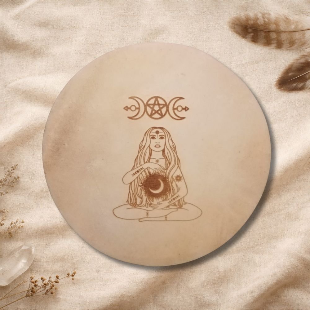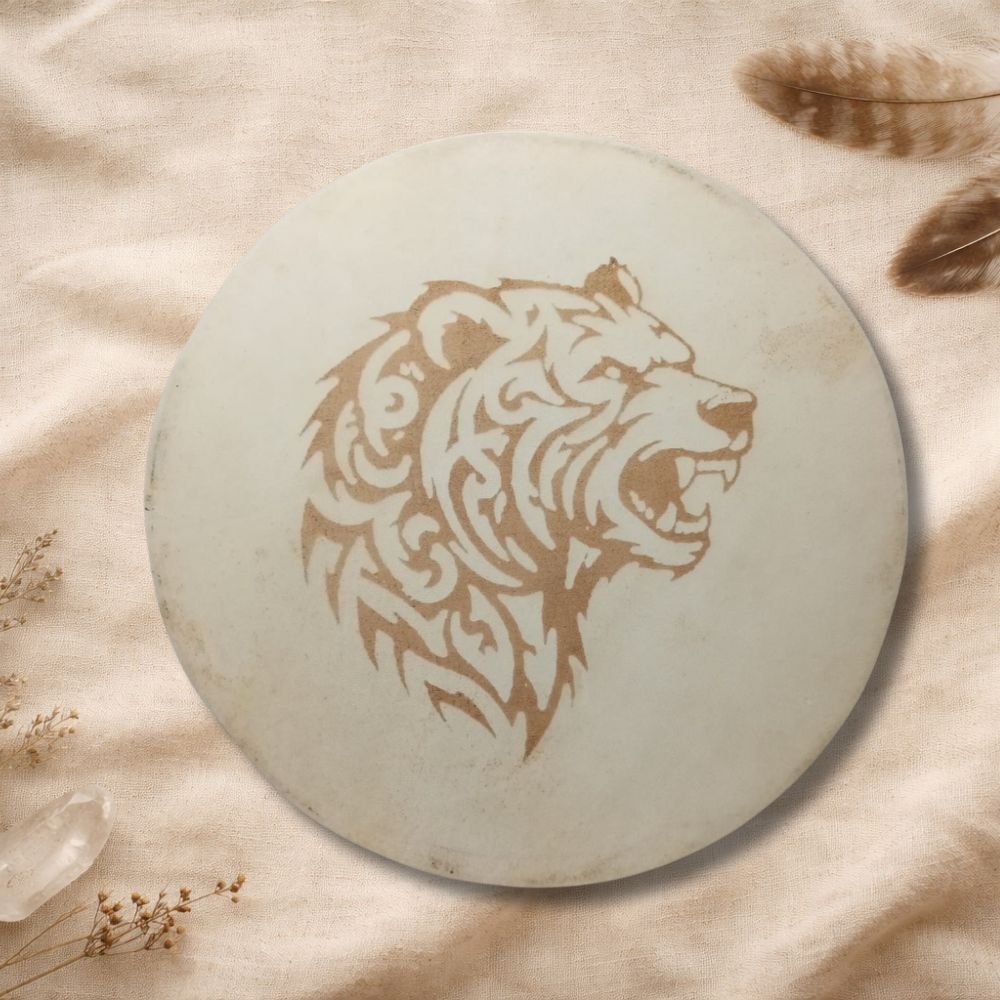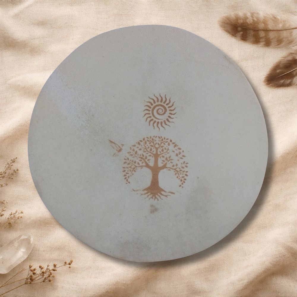 Además, el tambor incluye un grabado en el cuero, realizado con dedicación y precisión, integrando símbolos, imágenes o diseños que acompañan y sellan energéticamente el propósito del instrumento. Este grabado convierte cada tambor en una obra viva, cargada de significado y poder personal.